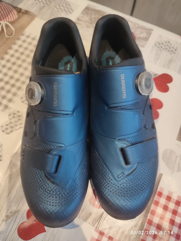 Shimano RC502 blue. Taille 44 (pas dispo dans le menu déroulant). Portée une saison. D'autres photos peuvent être envoyées. Prix neuf 160 €.Frais de port à charge de l'acheteur.